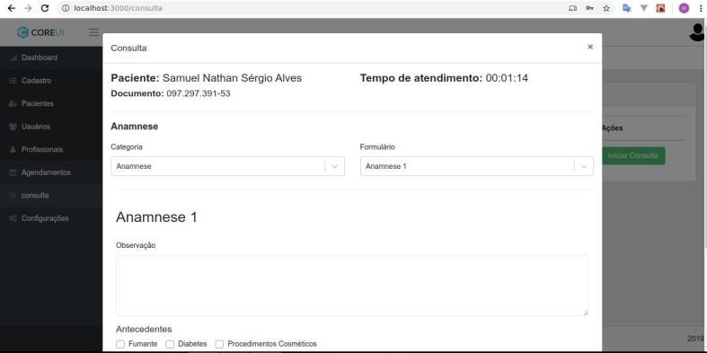The image below illustrates the consultation screen where the professional already chose which patient to attend and the main screen in the module opens, where the patient's main data is presented, the elapsed time of the consultation just below, the professional can choose which category of anamnesis form he wants to use.